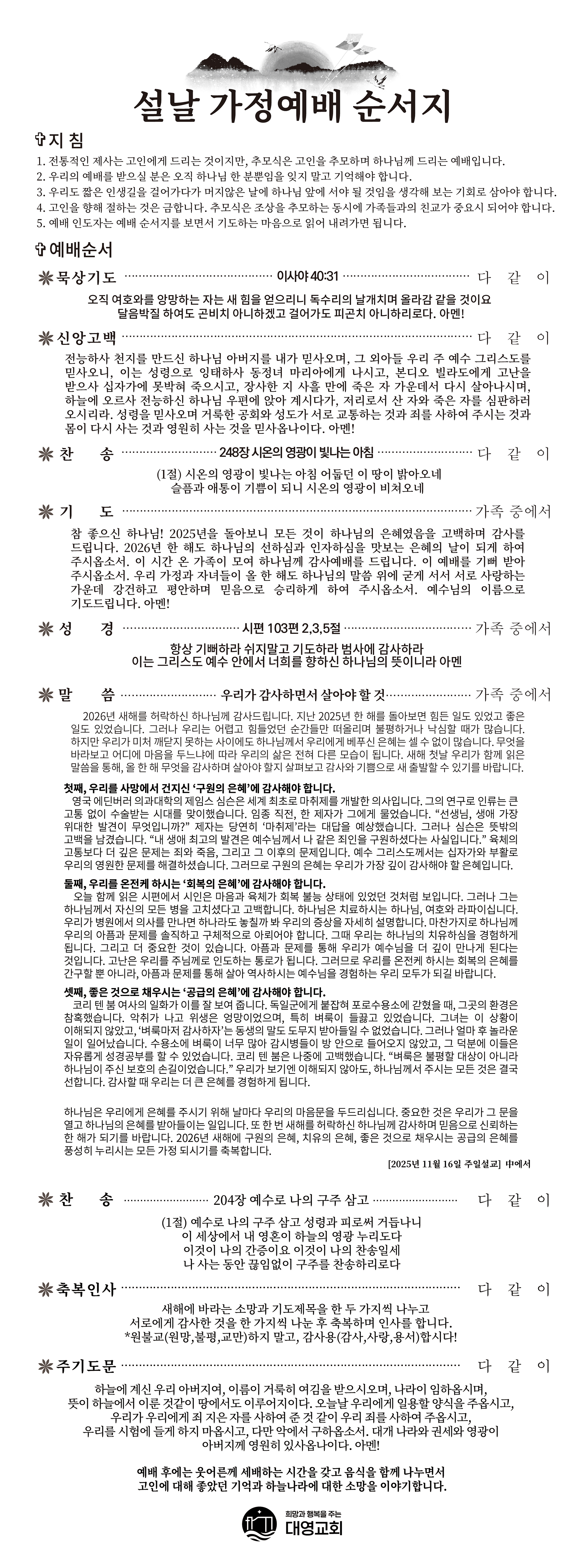2025년 송구영신예배 – 끝맺음을 잘할 때, 새해가 은혜로 열립니다 2025년의 마지막 날인 12월 31일(수요일) 밤 10시, 대영교회 성도님들이 한자리에 모여 한........공지사항